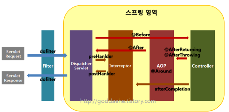 차이점 : filter는 dispatcher가 호출되기 전에 interceptor는 dispatcher가 호출되고 난 뒤 호출된다는 차이점이 있음