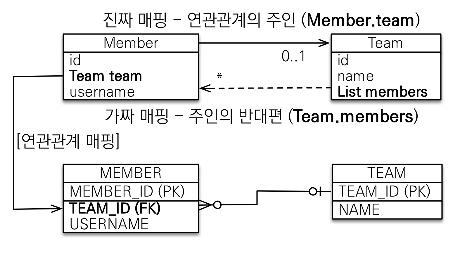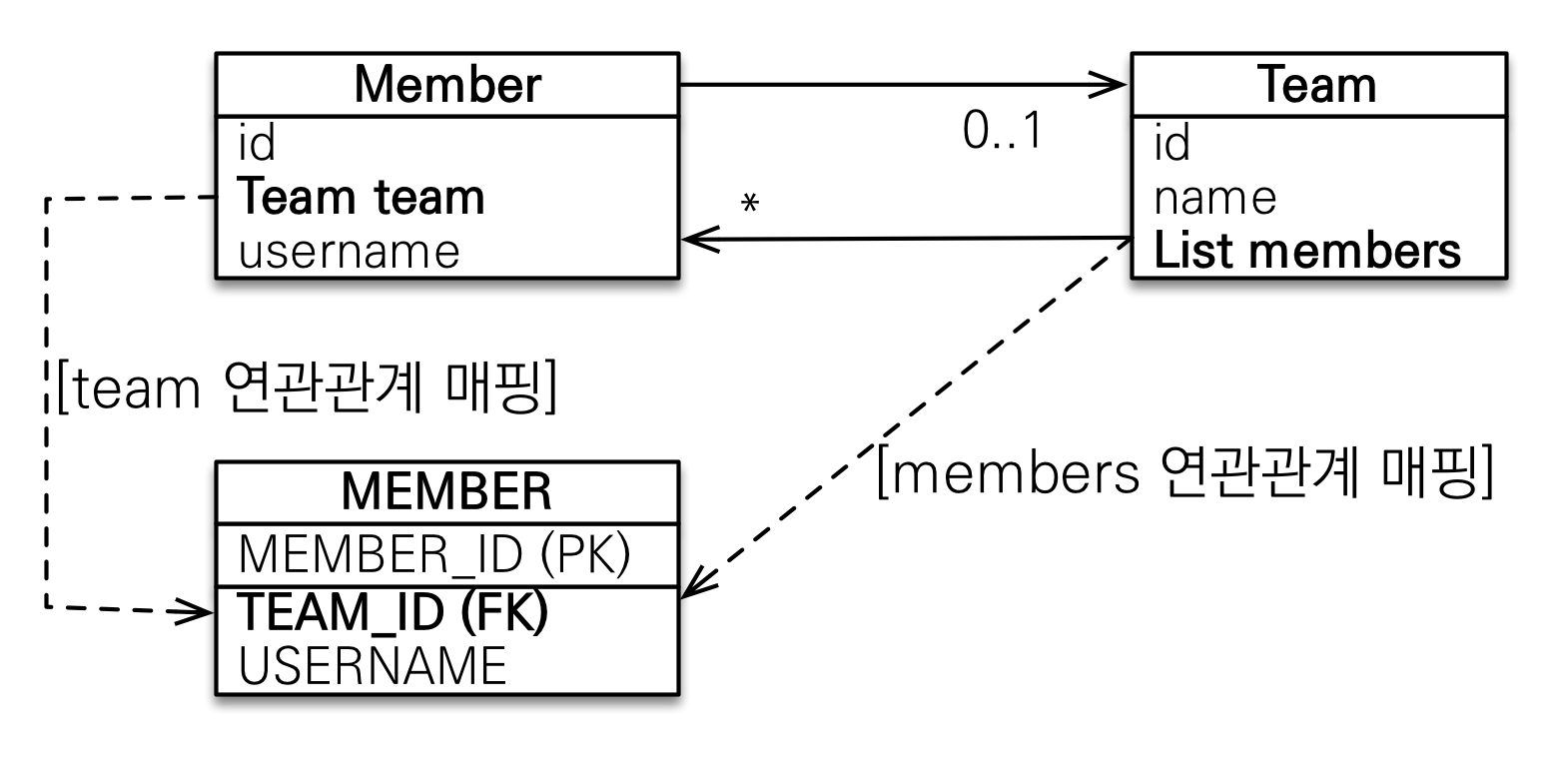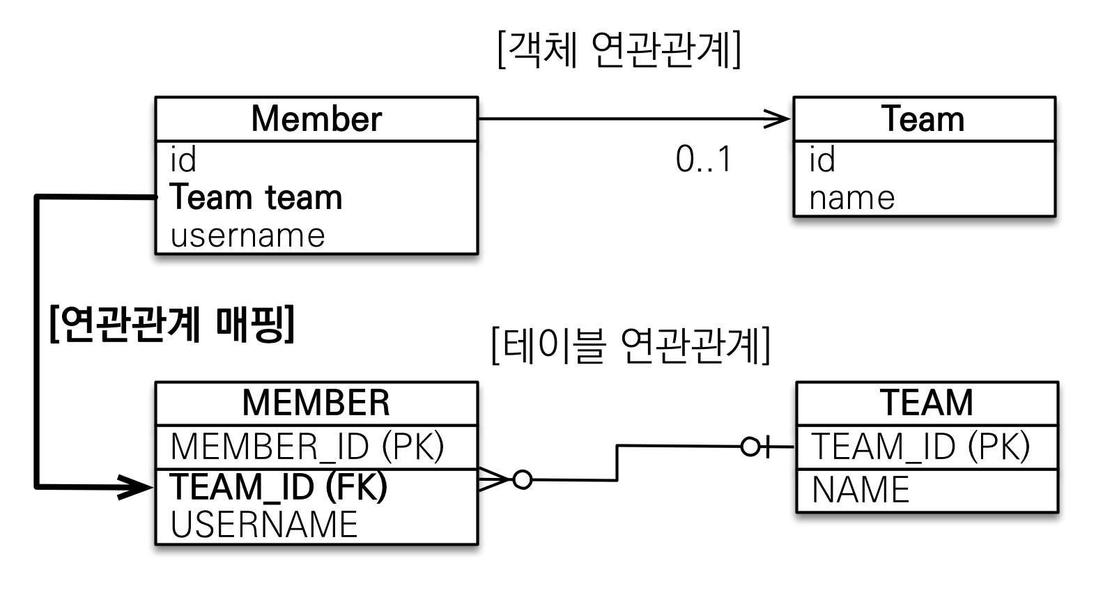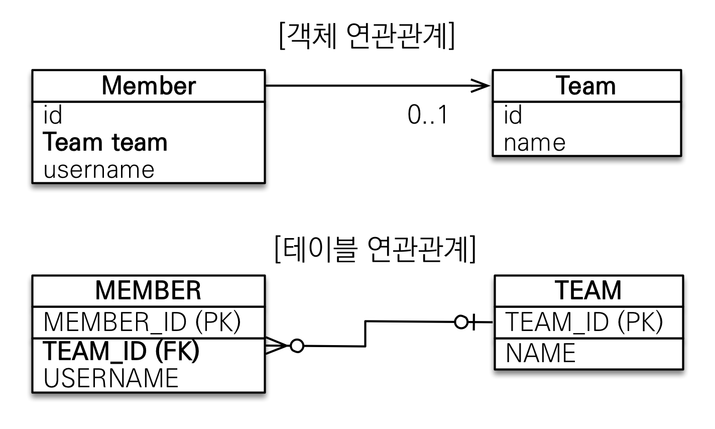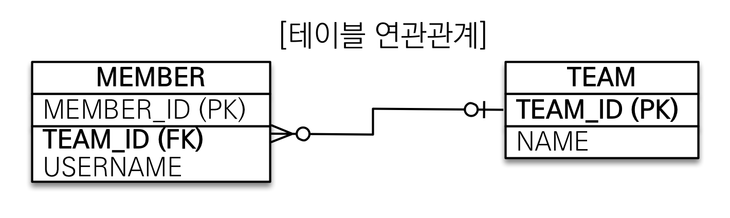 - 테이블은 외래키로 연관관계를 맺음