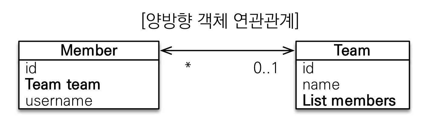 객체간에 연관관계를 양방향으로 만들고 싶으면 반대쪽에도 필드를 추가해서 참조해야함, 결국 연관관계를 하나 더 만들어야함 , 객체에선 서로 서로 참조하는것을 양방향 관계 ,따지고 보면 양방향 관계가 아니라 서로다른 단방향 관계가 2개인 것임 , 테이블은 외래키 하나로 양방향으로 조인가능